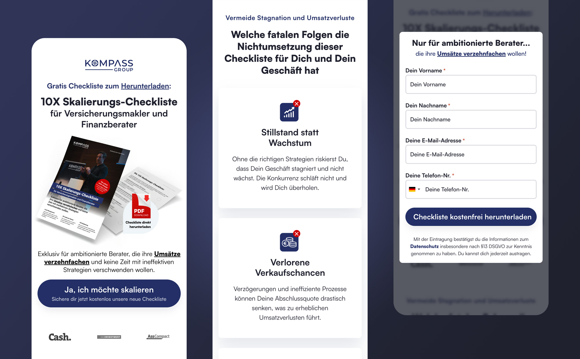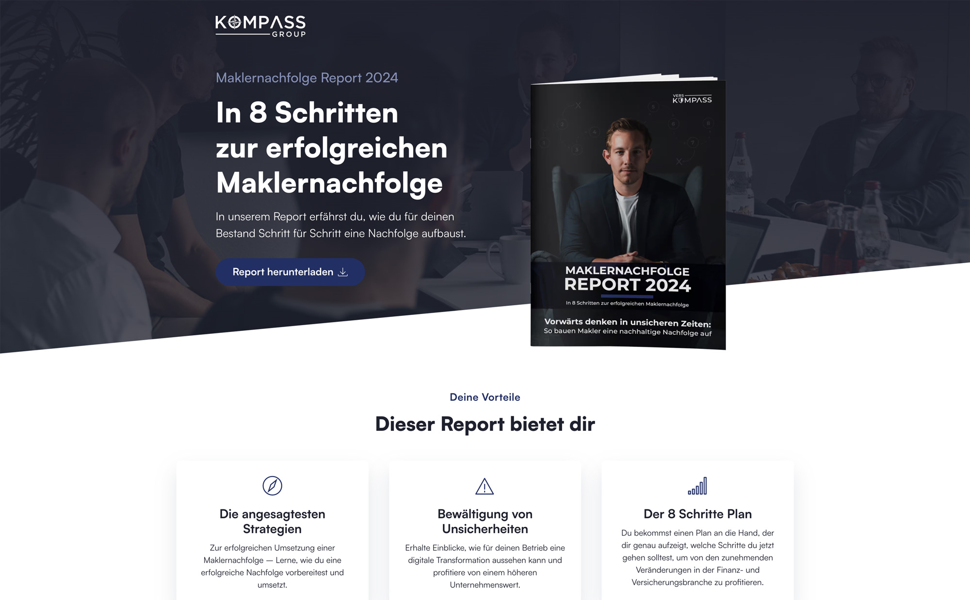 Zur effektiven Leadgenerierung entwickelten wir den „Maklernachfolge-Report“ und die „10X Skalierungs-Checkliste“. Sämtliche Grafiken und Icons wurden professionell und maßgeschneidert für die Kompass Group erstellt. Die Inhalte der Leadmagneten wurden teilweise von uns konzipiert und als hochwertige PDF-Dokumente final umgesetzt.