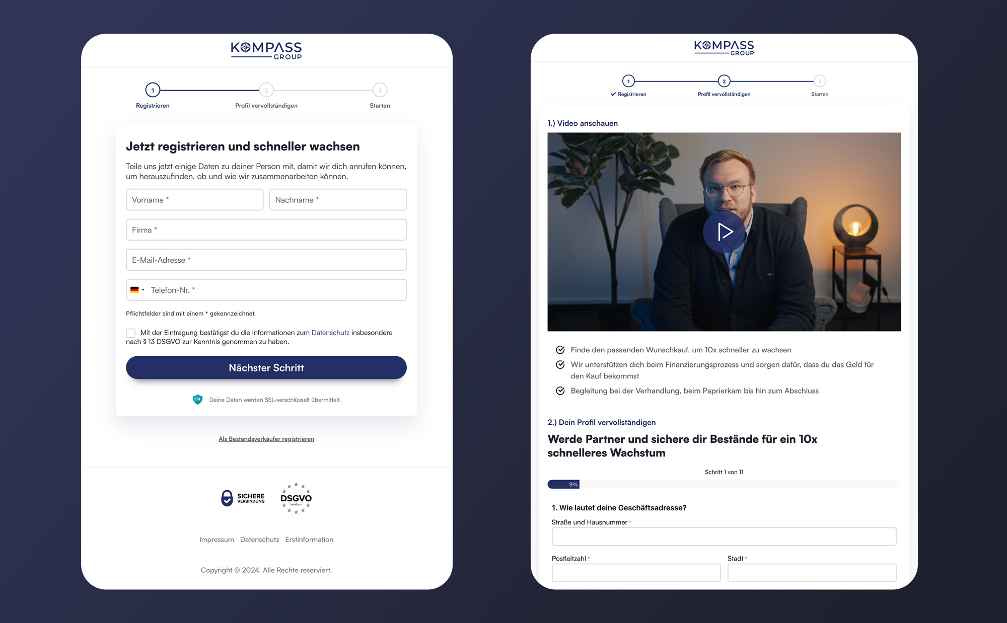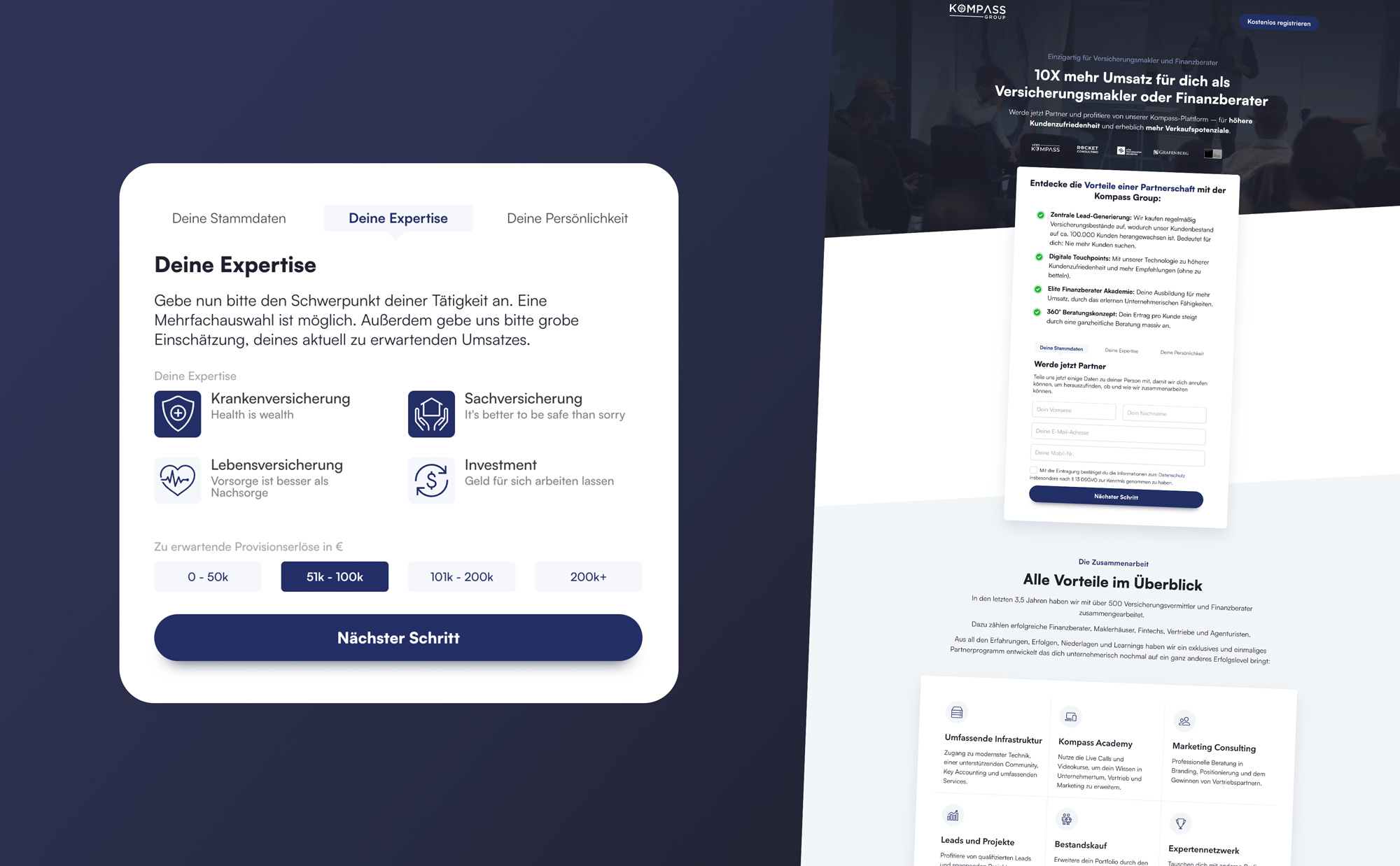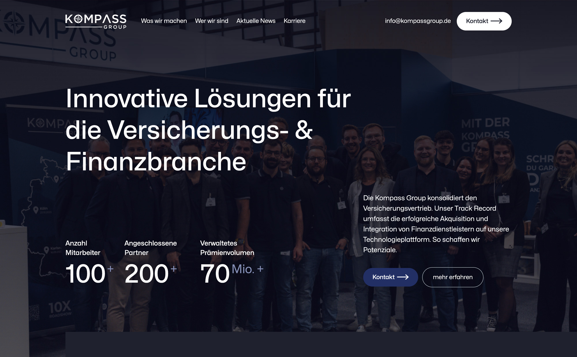 Die Kompass Group AG beauftrage uns, eine Corporate Website und unterschiedliche Funnel-Prozesse aufzubauen, um potenzielle Käufer und Verkäufer in der Versicherungs- und Finanzbranche effektiv zu gewinnen. Die Haupt-Herausforderung bestand darin, diese Maßnahmen schnell und gleichzeitig professionell umzusetzen. Die Zusammenarbeit mit der Strategiebasis GmbH erwies sich als der richtige Partner, um die gesetzten Ziele effizient zu erreichen.