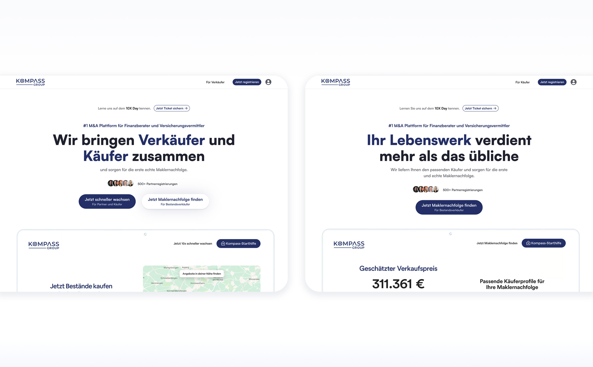 Um die beiden Zielgruppen – potenzielle Käufer und Verkäufer von Maklerbeständen – effektiv anzusprechen, erstellten wir maßgeschneiderte Landeseiten und Funnel-Prozesse. Diese Funnels dienen als Vorstufe einer M&A Plattform und ermöglichen eine effiziente Lead-Generierung und -Qualifizierung.